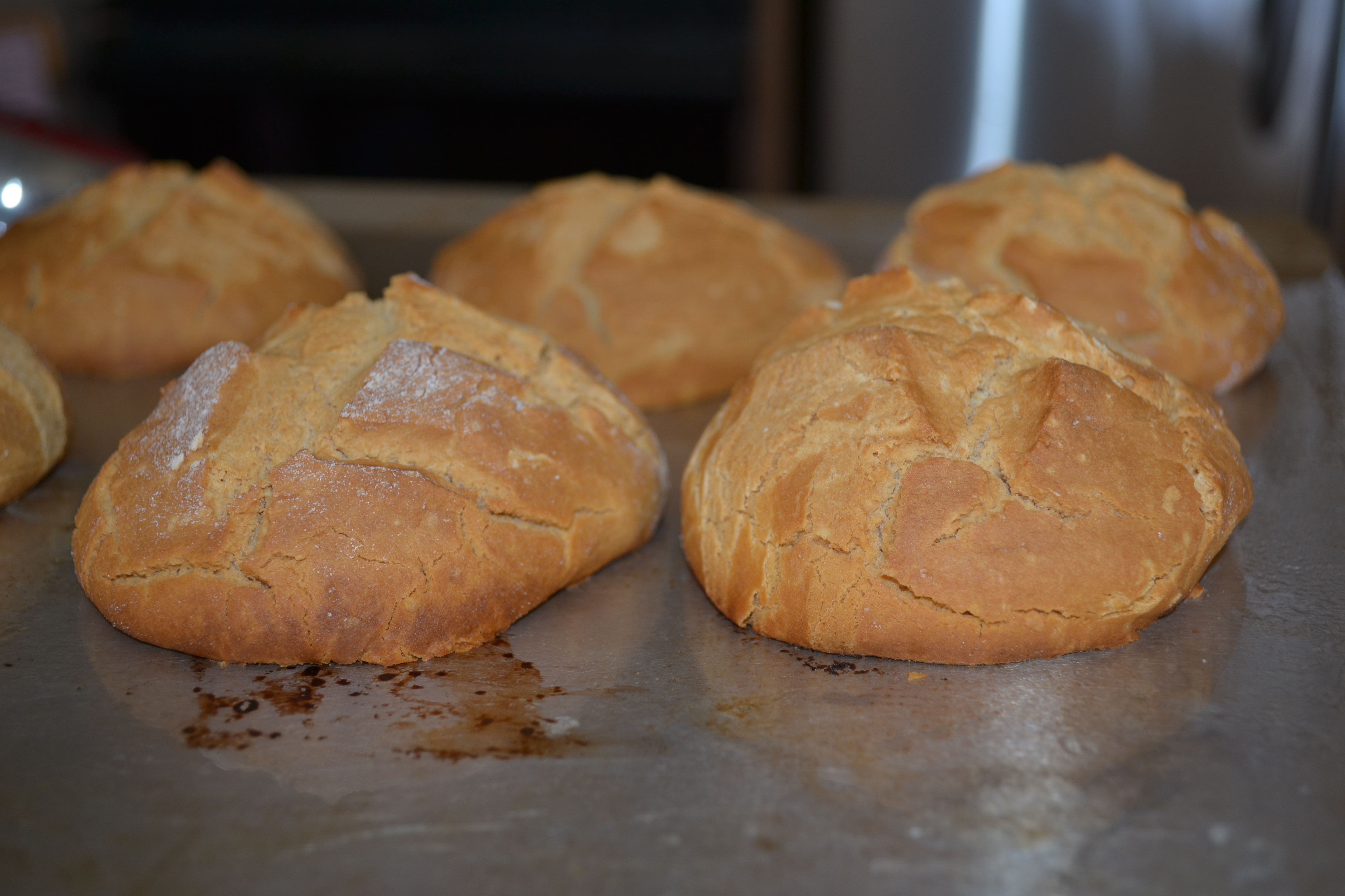 5. Flour your hands and form dough into palm size balls and place on a silpat or very well greased baking sheet. Cut cross into top and dust with a mixture of milk and flour. (If using GF flour you will need extra flour to kneed in at this step.)