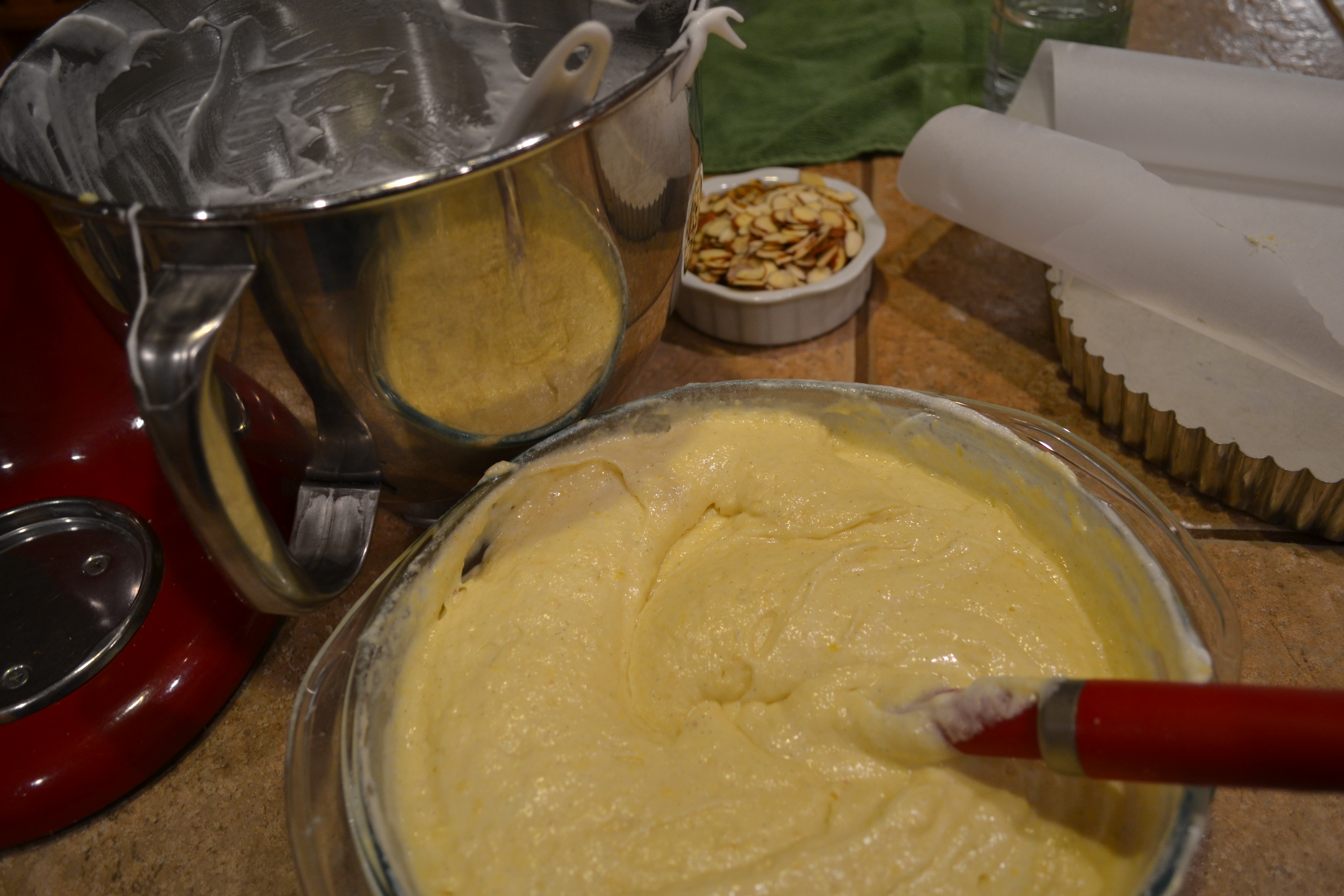 Pour the mixture into the pan carful to help the batter settle evenly. Trim excess parchment paper and evenly spread almond slivers over top of batter. Place the cake in the center of the oven and bake for 40-45 minutes or until cake is firm to touch in the center.