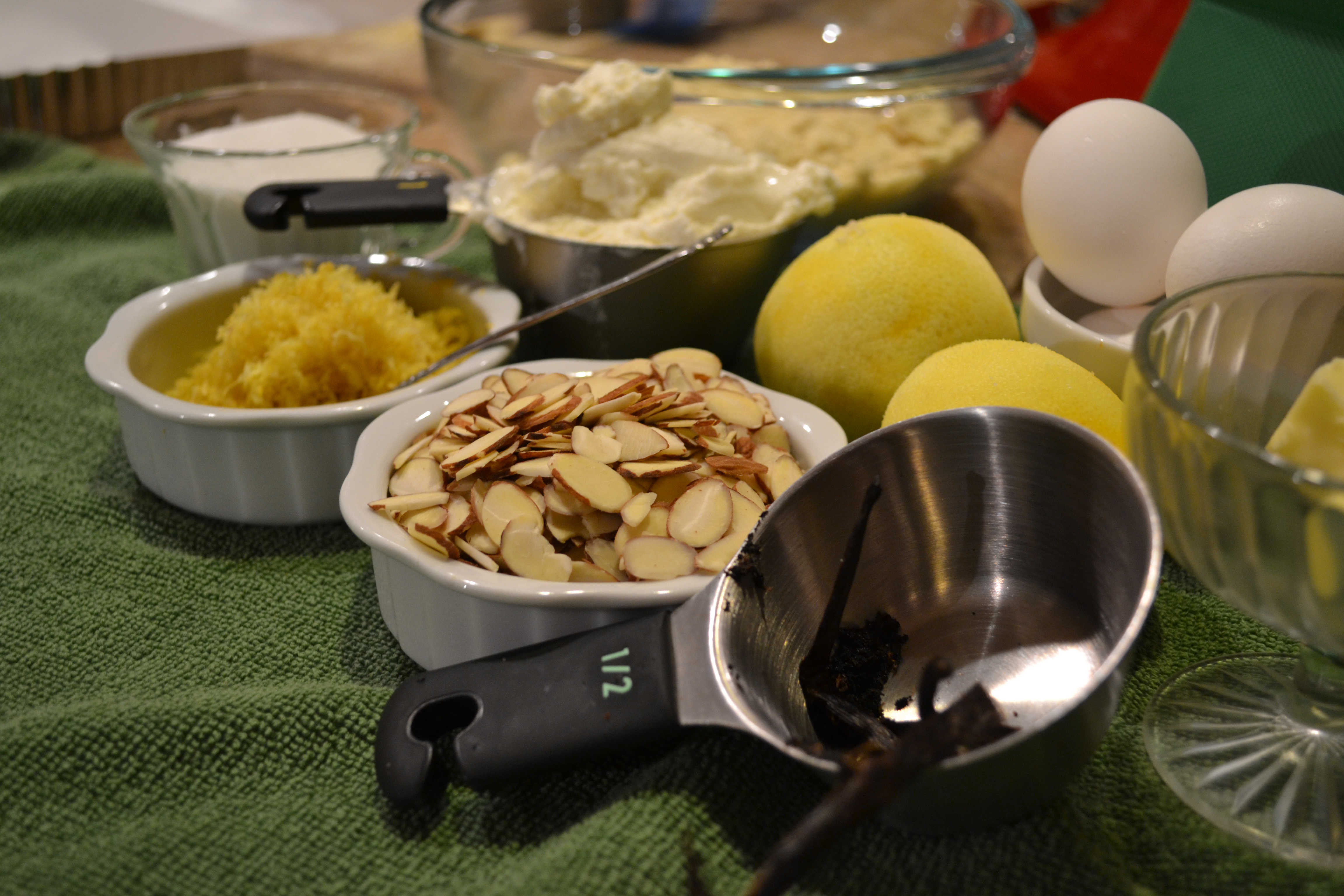 Cream the butter, 1 cup of the sugar, vanilla seeds, and lemon zest in an electric mixer until pale and creamy, about 8-10 minutes. Scrape the sides of the bowl and gradually add the egg yolks, one at a time, continuing to beat until combined. Slowly add the almond meal while still beating. Fold in ricotta cheese until combined. Whip the egg whites into soft peaks and gently fold into mixture with spatula.