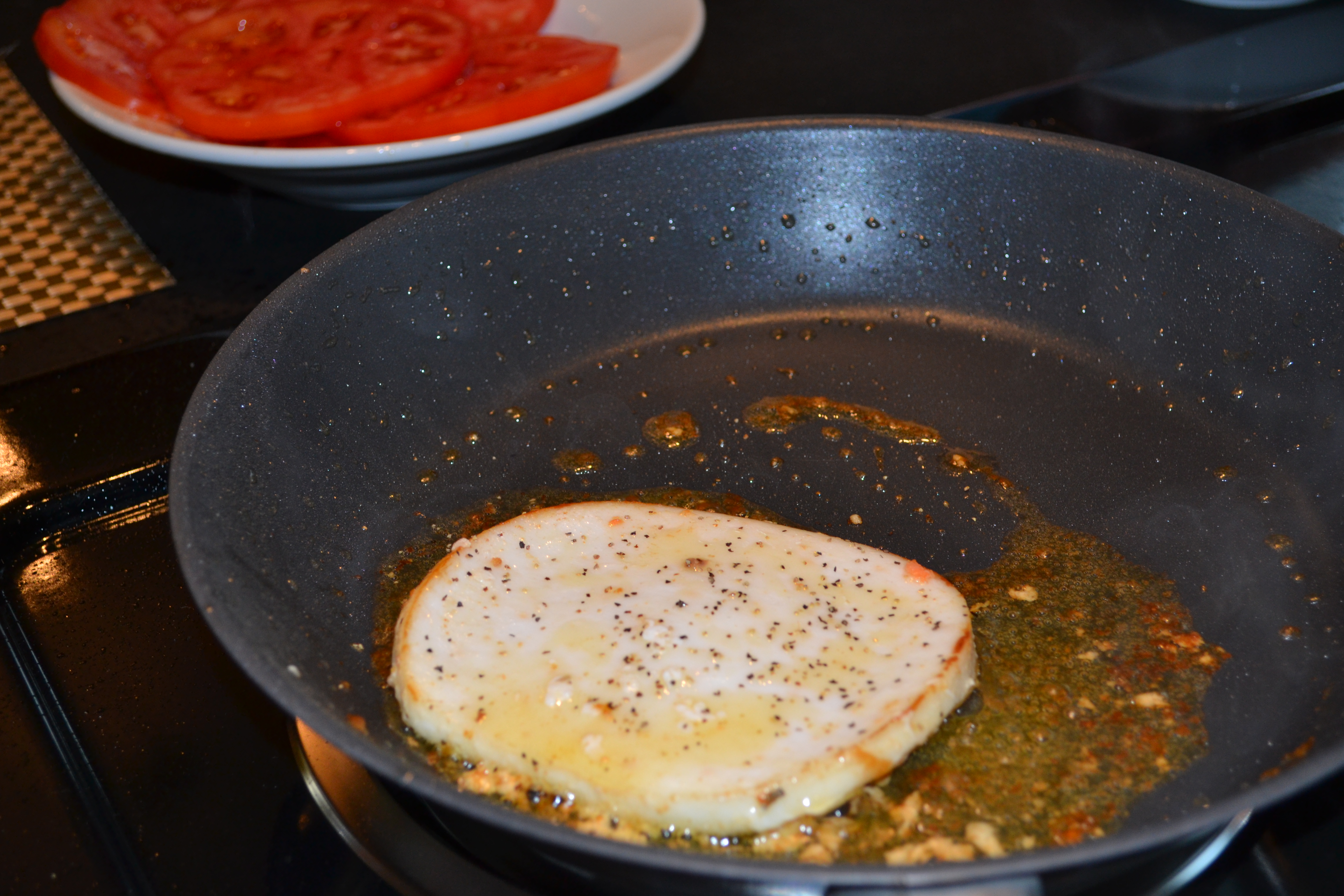 Just coat the bottom of the frying pan with olive oil and heat over medium.