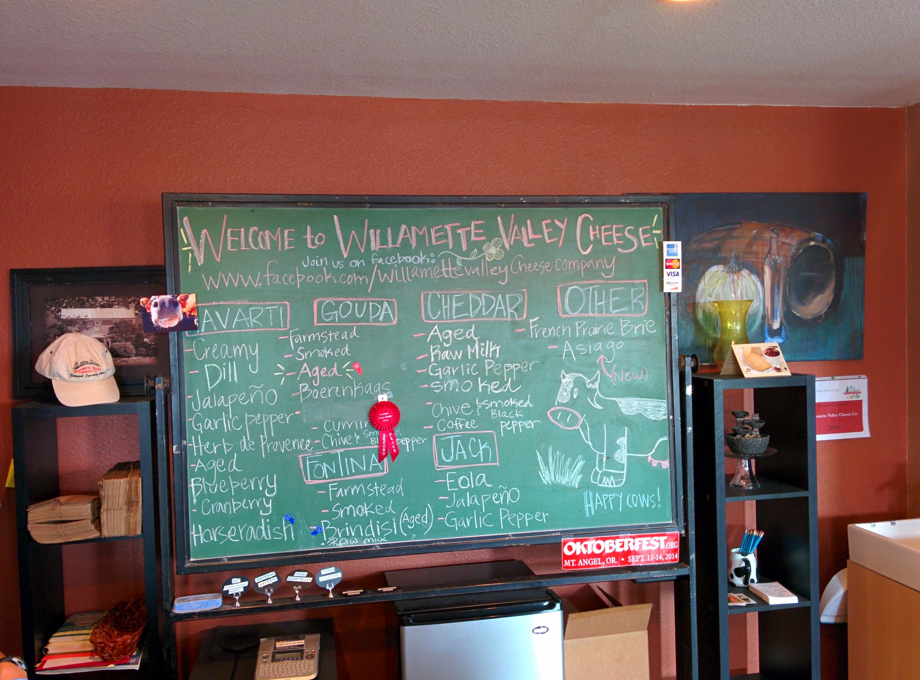 The final day of our trip in McMinnville, we decided to cook in the well equipped kitchen of our hotel room. We struck out across the beautiful hilly landscape of the Willamette Valley to look for local markets to collect our bounty for the evening meal. There was no menu in mind, just a desire to see what ingredients the valley had to offer us. First, we happened across the Willamette Valley Cheese Company, a small dairy tucked just off a main highway. Entering the property took us past grazing goats on one side of the road and cows on the other. The dairy has a small store and offers tastings of all the cheese they sell. We had great fun deciding which cheese we wanted to start our meal with even though we had no idea yet what our meal would be. Finally, we settled on smoked fontina and smoked gouda as possible appetizer ingredients.