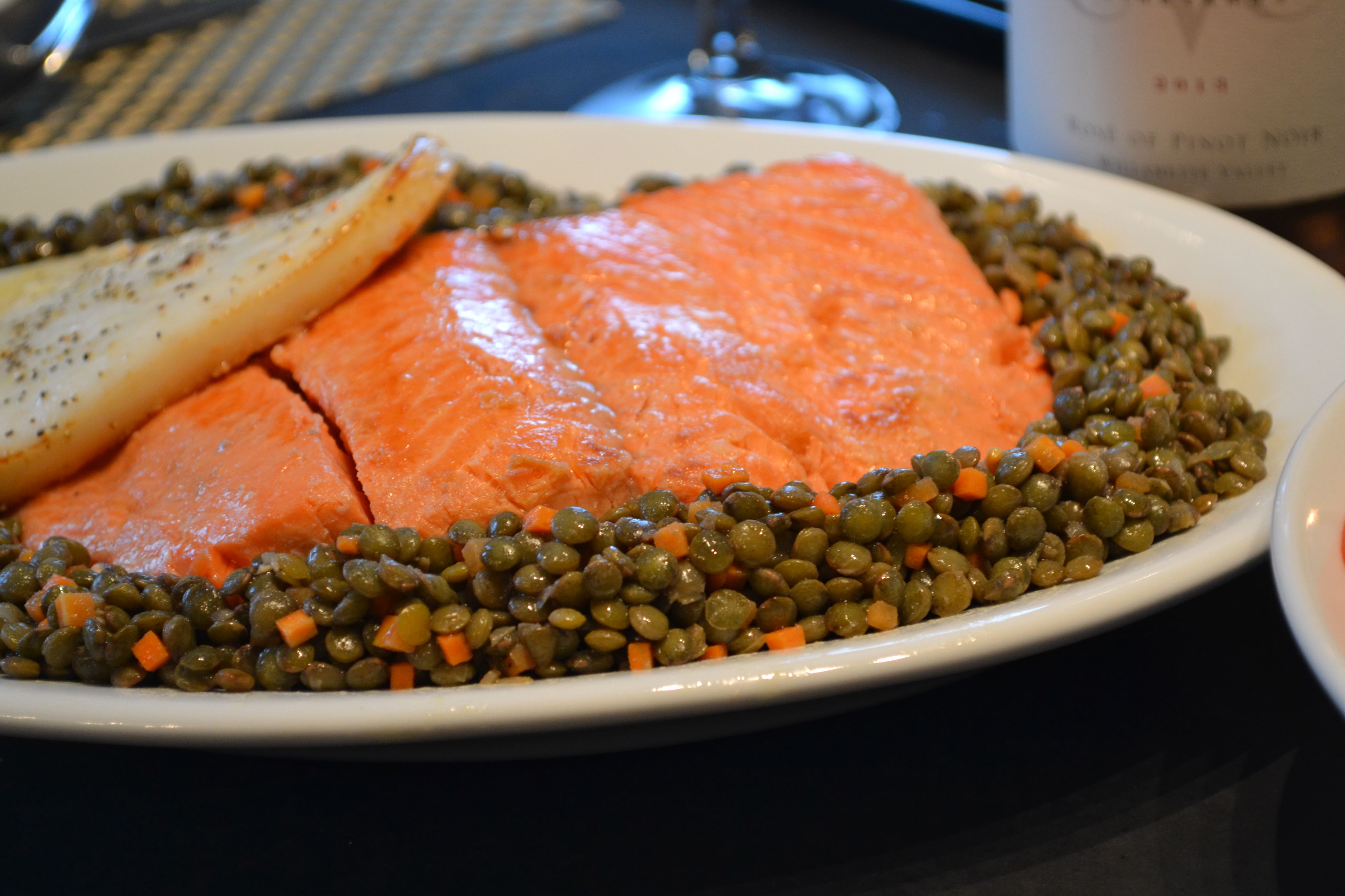 Place the lentil salad on the platter and arrange the salmon and calamari on top.